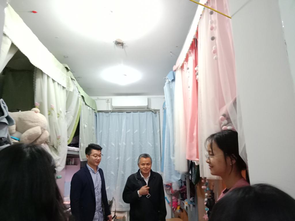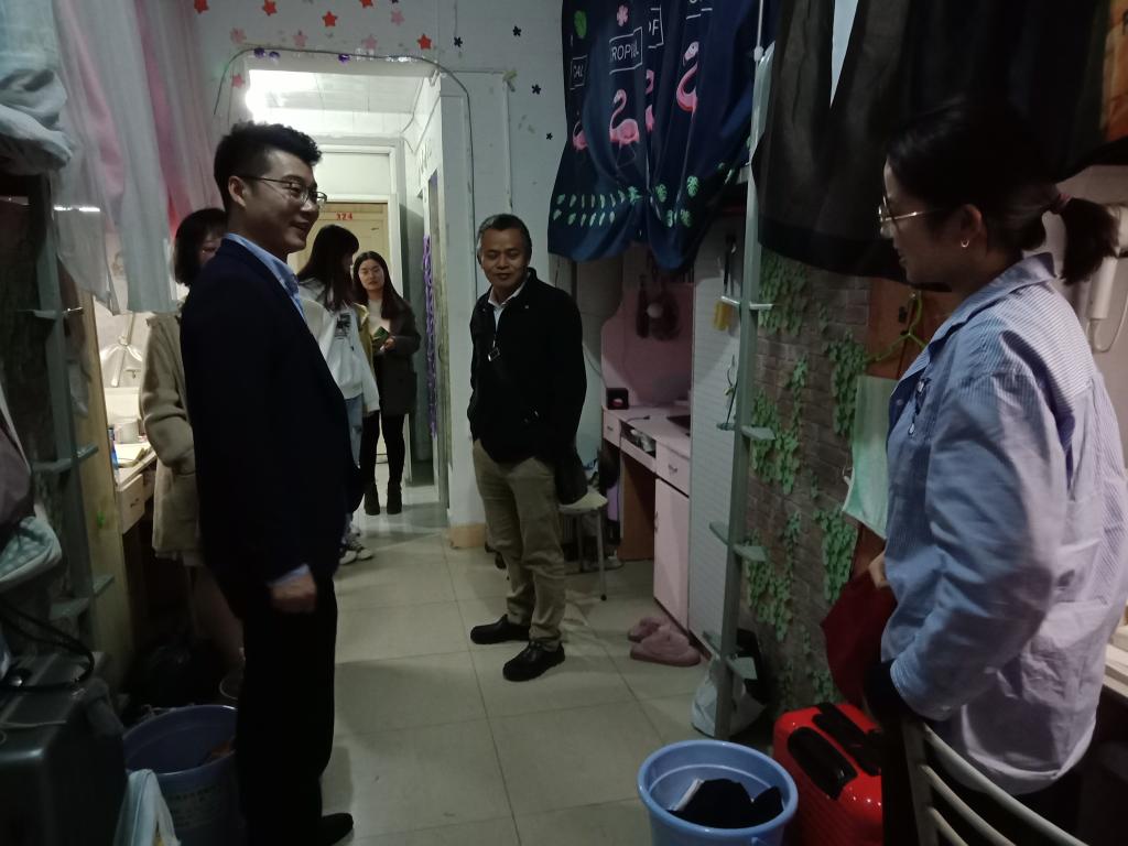 本次检查内容包括宿舍卫生检查与宿舍安全用电。在检查中,李心伟书记以及许瑞老师对同学所做不足之处进行指出,并表扬女生寝室的环境卫生,期望男生多向女生学习。李心伟书记亲切地与员工就如何创建文明宿舍进行交谈,并嘱咐同学们多花点时间学习、切勿沉迷于游戏。最后,他还叮嘱同学们“昼夜温差变化大,要注意保暖”。