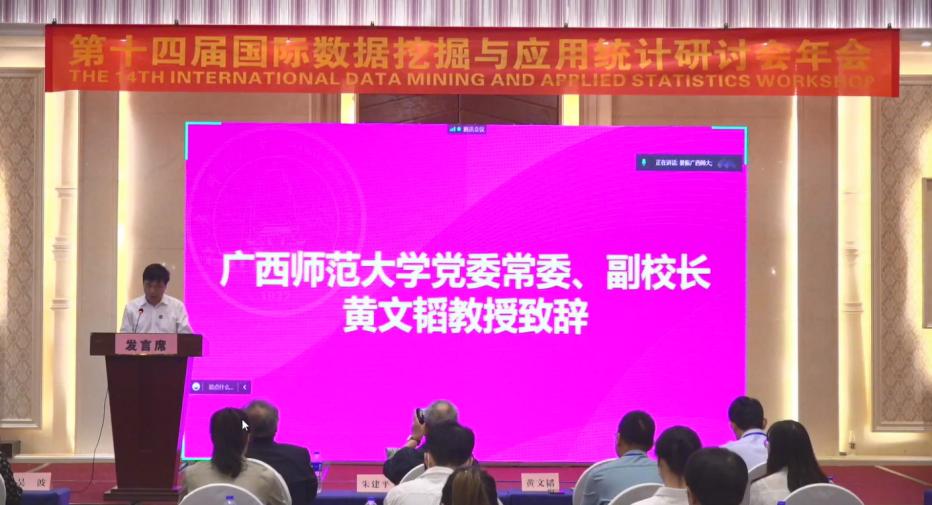 开幕式上广西师范大学副董事长黄文韬教授作致辞演讲,并代表学校对参会人员表示热烈欢迎。学会会长朱建平教授致辞,并代表国际数据挖掘与应用统计研究会组委会以及中国商业新葡萄8883官网数据科学与商业智能分会对各位嘉宾的到来表示衷心感谢和欢迎。