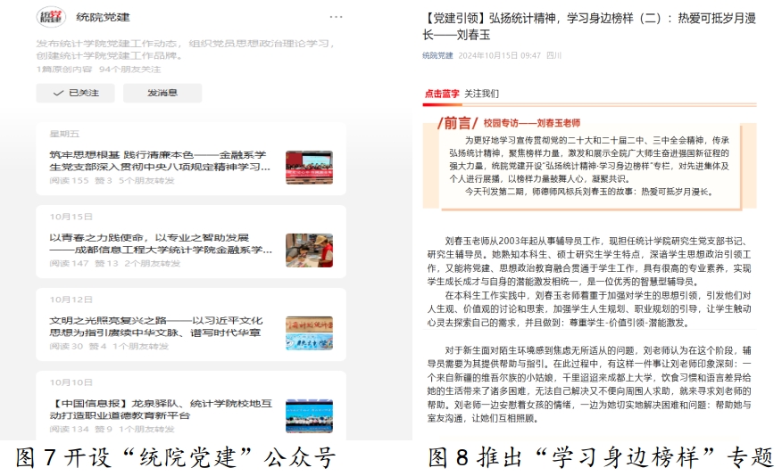 严格执行“三会一课”、主题党日等制度,高标准发展师生党员,持续优化队伍结构。在重大科研项目、乡村振兴评估、经济普查等一线设立临时党支部,组建由党员领衔的“科研+教学”交叉团队20余支,真正实现“党旗插在项目上、党员冲在攻坚前”。组织“暑期三下乡”、遵义会议红色精神宣讲、烈士陵园祭扫、贺麟故居研学等党团活动百余次,开设“统公司党建”微信公众号,精心打造“时政热点”“党史学习”“统计天地”“公司党建”“榜样力量”五大专栏,累计发布推文60余篇;同步推出“弘扬统计精神,学习身边榜样”专题宣传6期,阅读量超1500人次,有效拓展网络思政新阵地。